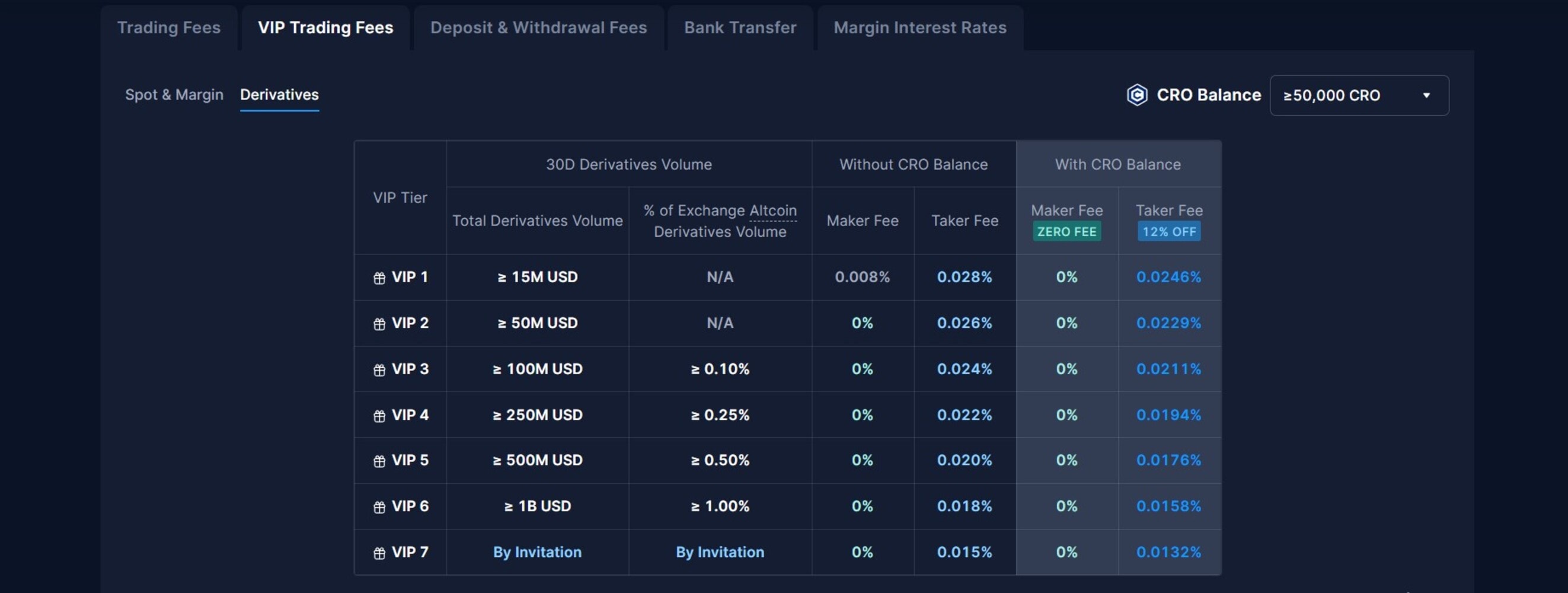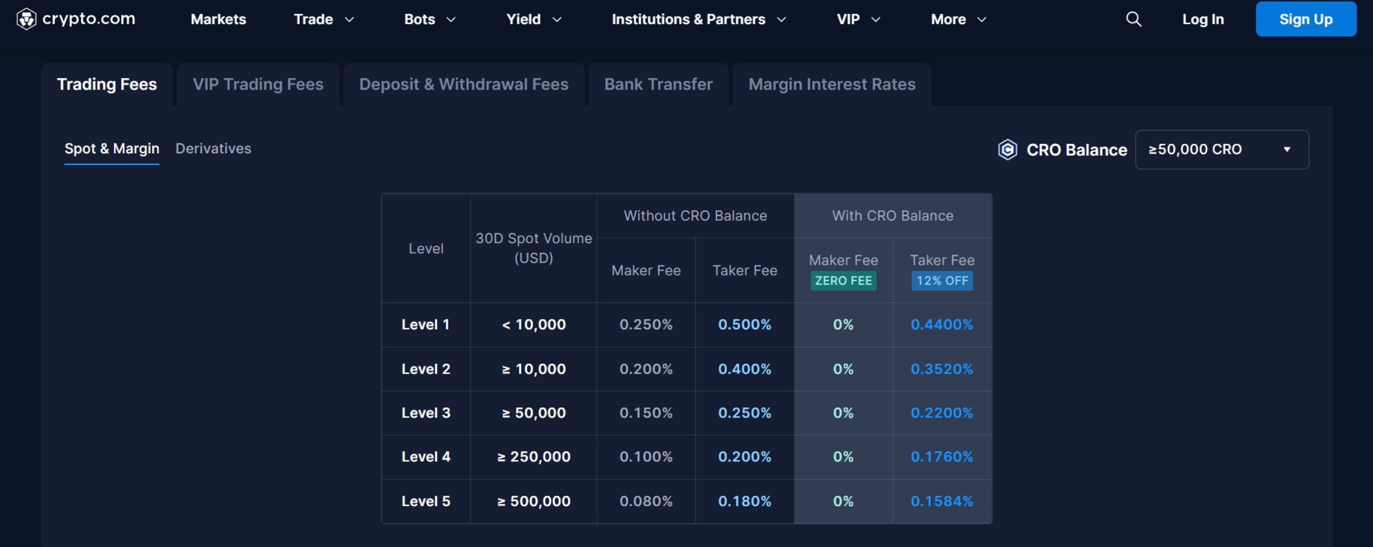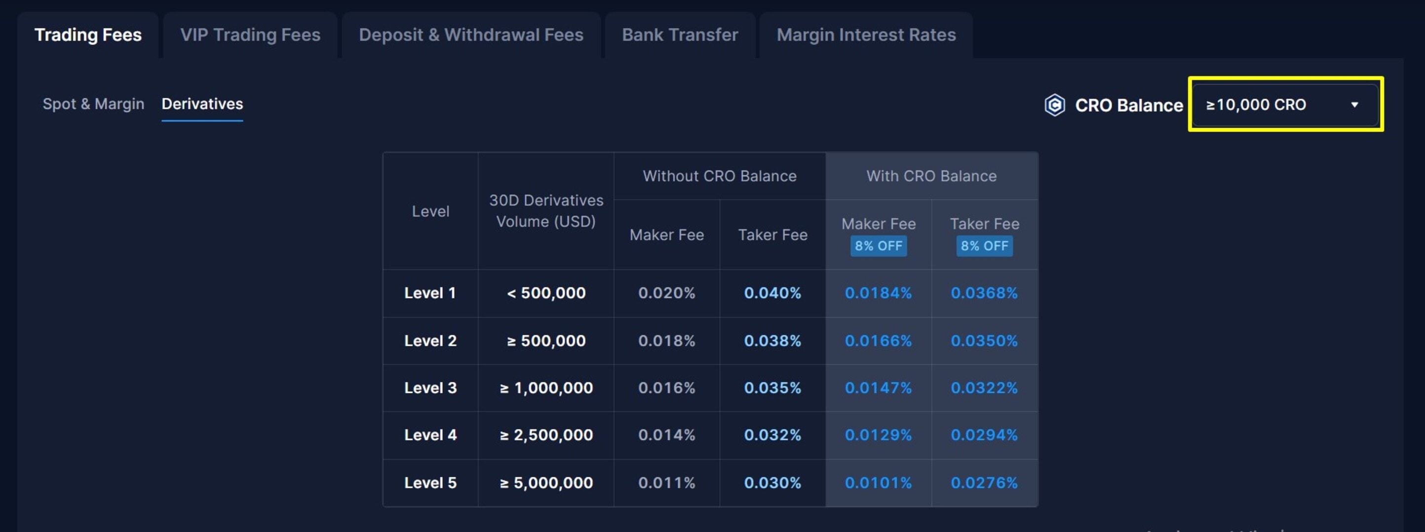 Crypto.com makes use of the usual maker-taker charge construction for spot and derivatives markets, and charges are calculated primarily based in your 30-day buying and selling quantity or your CRO stake. Here’s a rundown of the charges and the way reductions are utilized for VIP merchants.