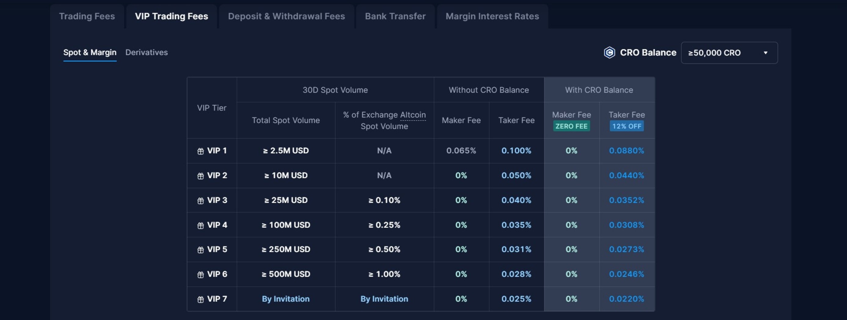 Charge Reductions (With CRO Steadiness): To cut back charges, customers can both improve their buying and selling quantity or stake CRO tokens. For instance, staking 10,000 CRO can decrease the maker and taker charges to 0.23% and 0.46%, respectively. Yow will discover the VIP charge construction for spot buying and selling beneath.
