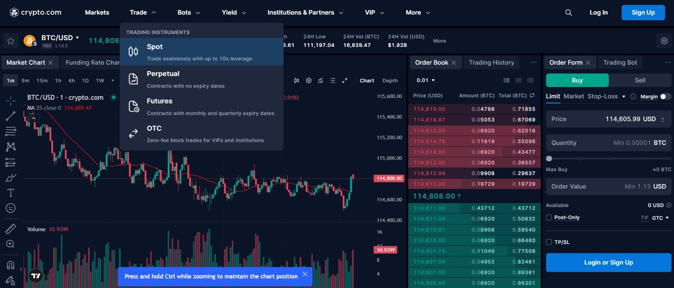 Spot and derivatives buying and selling on Crypto.com is much like that of different platforms. The change permits merchants to commerce varied digital property on the spot market at present market costs, with minimal threat aside from market fluctuations. In the meantime, superior merchants who need to improve their positive aspects can use derivatives merchandise reminiscent of futures and perpetual contracts.